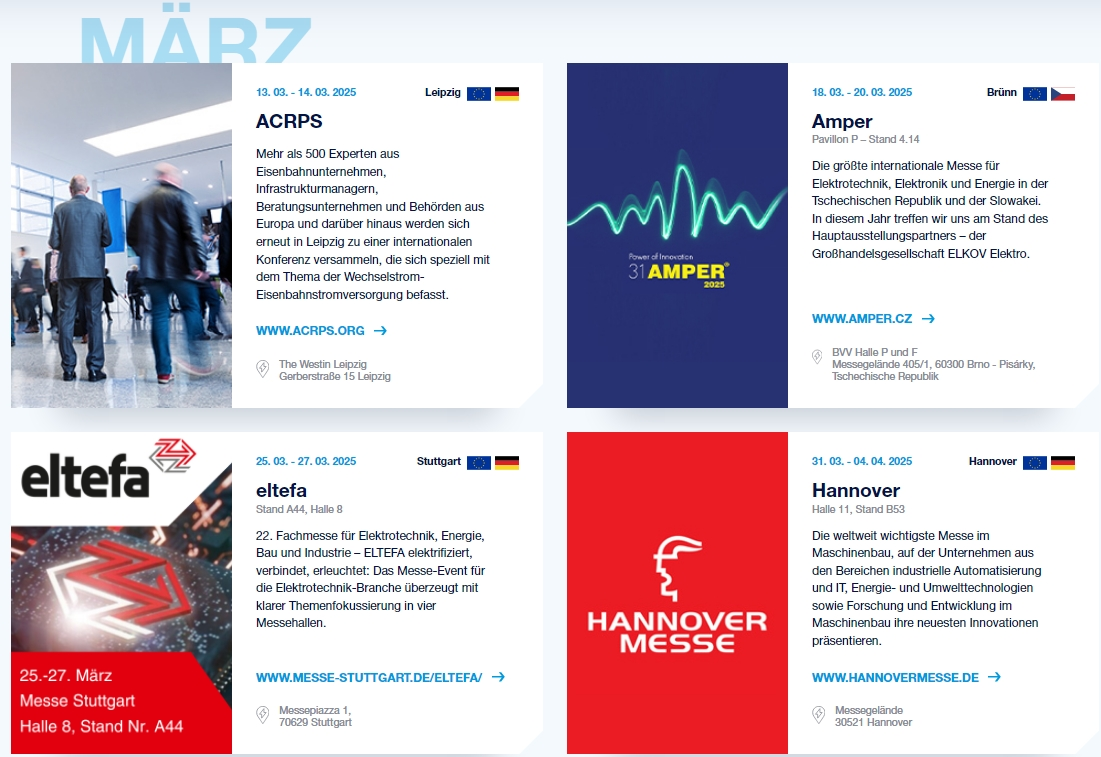 Wir beginnen den Monat auf der traditionellen ACRPS-Fachkonferenz für Eisenbahnexperten in Leipzig und ziehen dann weiter nach Brünn, wo wir am Stand unseres Hauptausstellungspartners ELKOV unsere neuesten Innovationen und Lösungen präsentieren. Das Monatsende verbringen wir erneut in Deutschland – zuerst mit unserem Partner E.P.S. auf der Messe in Stuttgart und dann direkt weiter nach Hannover zur beeindruckenden Messe, auf der wir ein neues Produkt für den deutschen Markt vorstellen. Wir freuen uns auf Sie!