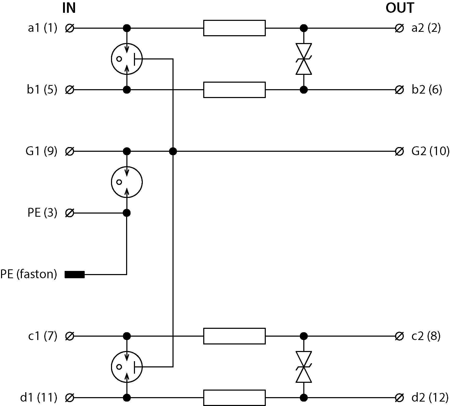 - Gegen Längsüberspannung (Leitung-Schutzerde) Grobschutz, gegen Querüberspannung (Ader - Ader) Grob- und Feinüberspannungsschutz und (Ader - GND) Grobschutz