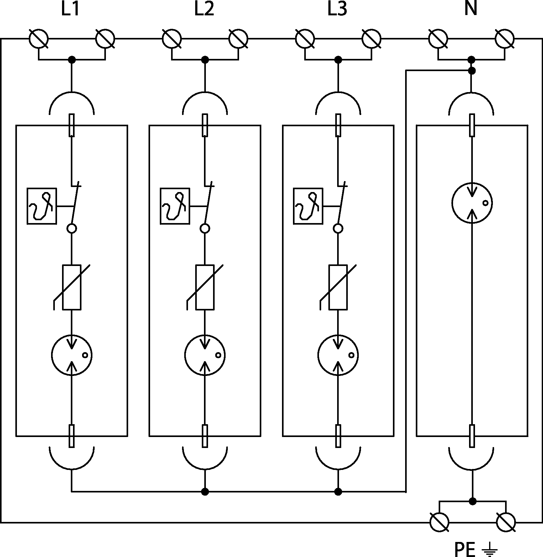 - Eine Kombination aus dreipoligem hochleistungsfähigem Blitzstromableiter und gekapselter hochleistungsfähiger Funkenstrecke, verbunden im 3+1 Betriebsmodus