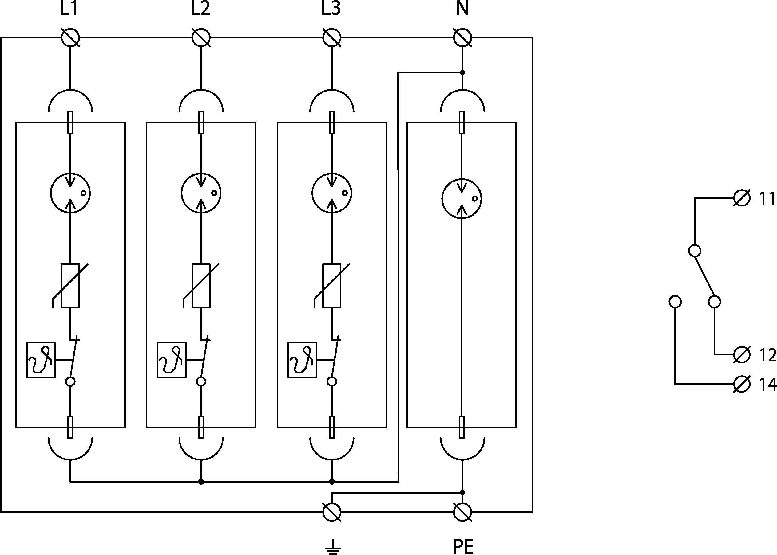 - Eine Kombination aus Kombi-Überspannungsableiter (Serienschaltung Varistor + GDT) und gekapselter Funkenstrecke, verbunden im 3+1 Betriebsmodus