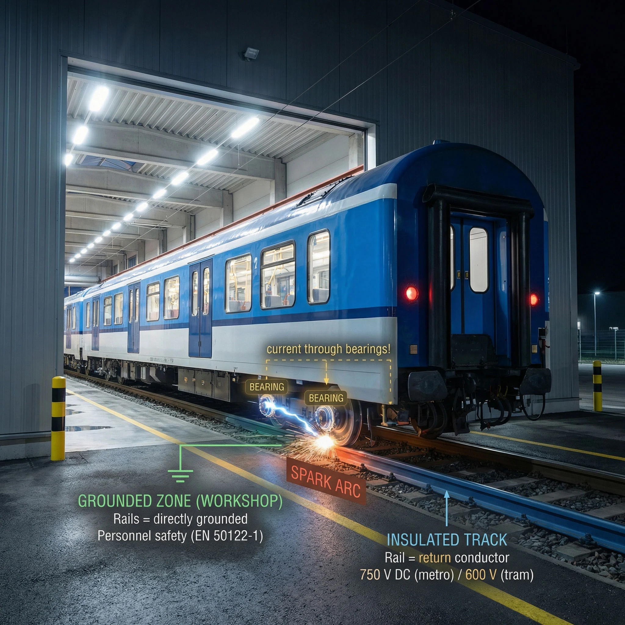 On the main line, rails act as the return conductor for traction current (750 V DC for metro, 600 V DC for tram systems) and are insulated from earth. In depots and maintenance areas, rails must be directly grounded for personnel safety. The ČSN EN 50122-2 standard requires separation of these two systems by means of an insulated rail joint (IRJ)—and this is exactly where the destructive arc occurs.