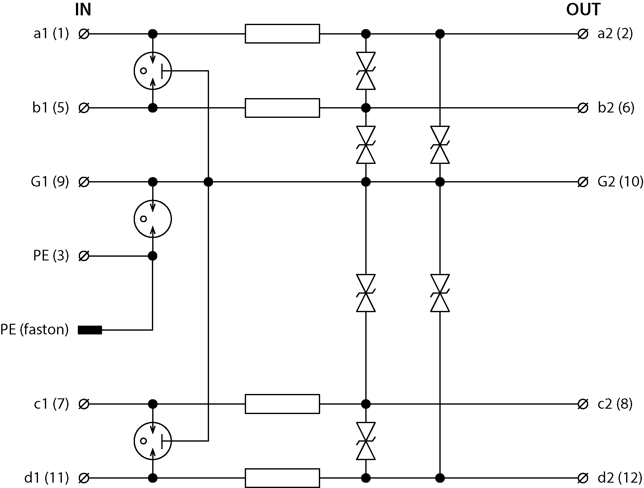 - coarse and fine surge protection (core – core, GND) in differential mode and coarse surge protection in common mode (line – PE)