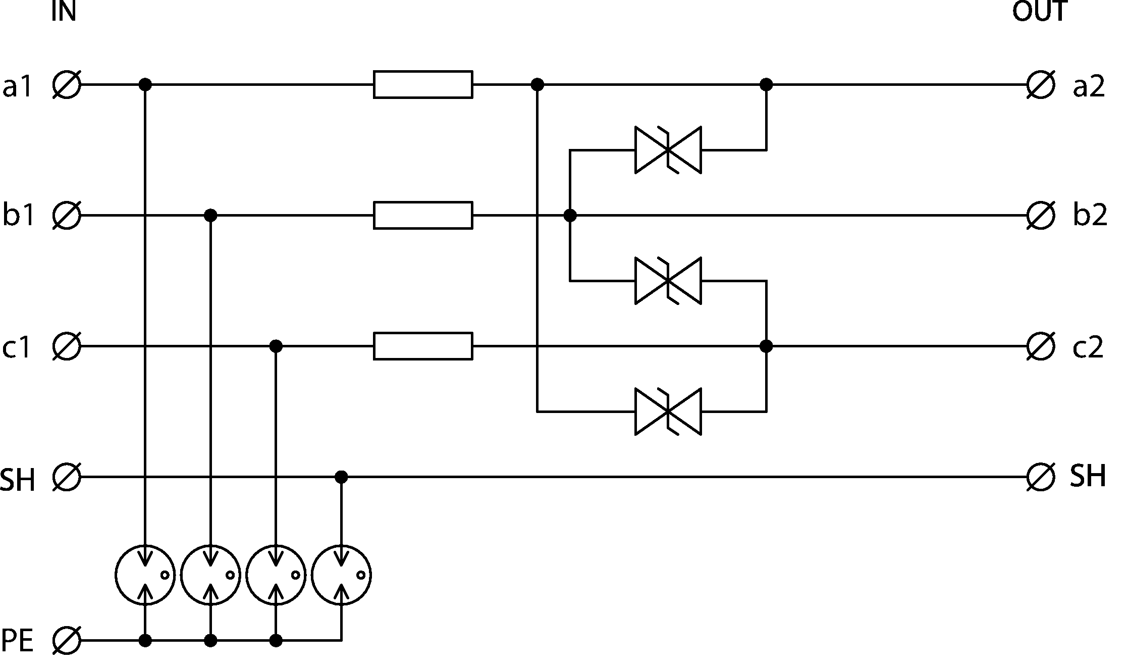 - coarse and fine surge protection in differential mode (core – core) and coarse protection in common mode (core – PE)