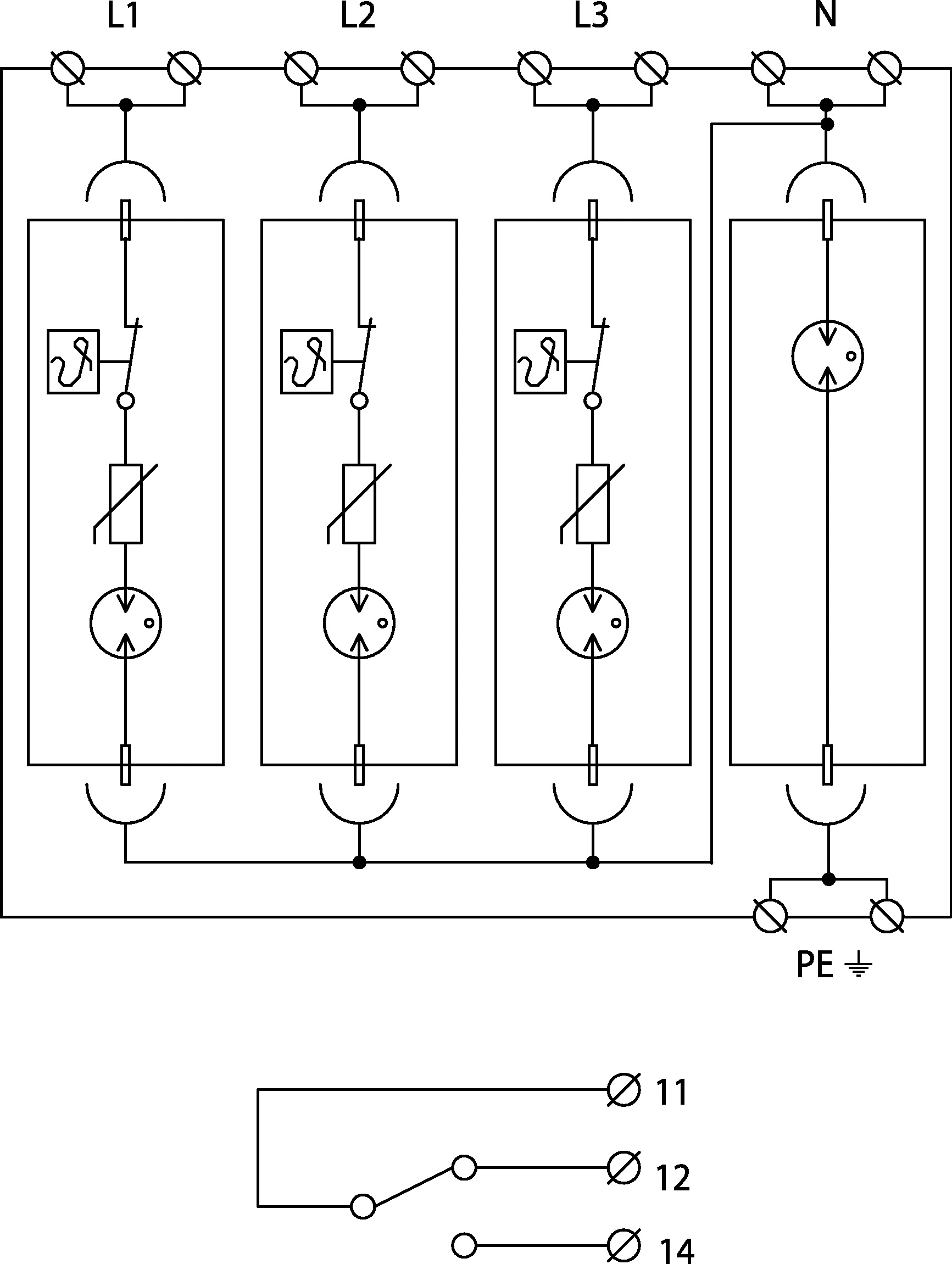- sestava třípólového velmi výkonného kombinovaného svodiče bleskových proudů a uzavřeného výkonného jiskřiště zapojených v módu 3+1