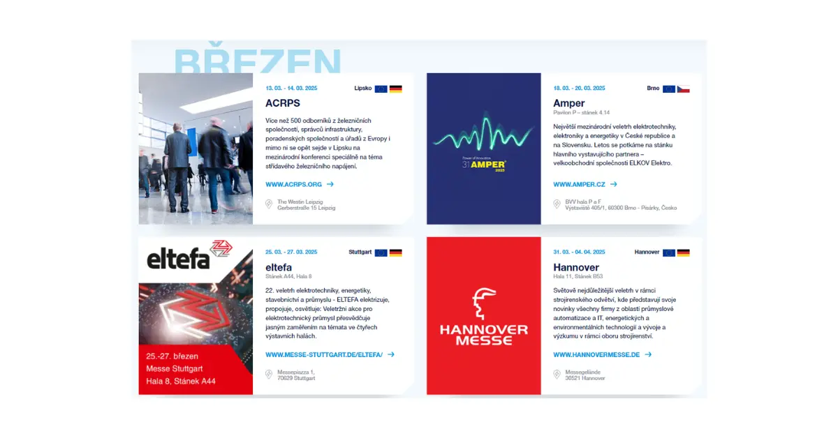 Mesiac začneme na tradičnej konferencii odborníkov na železnice ACRPS v Lipsku, potom sa presunieme do Brna, kde na stánku hlavného partnera výstavy spoločnosti ELKOV vystavíme naše novinky a riešenia. A koniec mesiaca opäť v Nemecku. Najskôr s naším partnerom spoločnosťou E.P.S. na výstave v Stuttgarte a potom hneď na Hannover – veľkolepý veľtrh, kde predstavíme nový výrobok pre nemecký trh. Tešíme sa na vás.