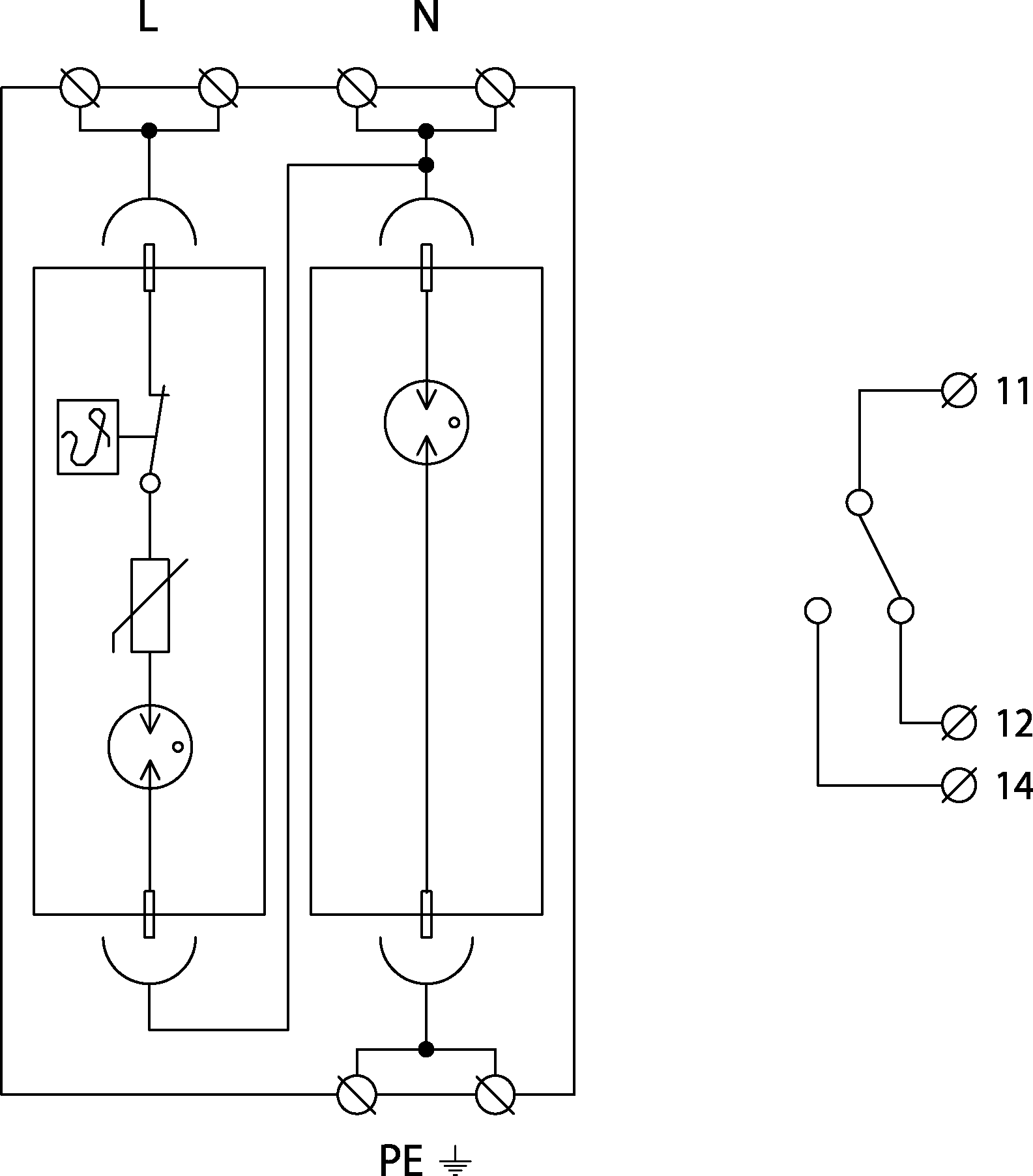 - Výkonný kombinovaný zvodič bleskových prúdov s uzatvoreným výkonným iskriskom zapojeným v móde 1+1