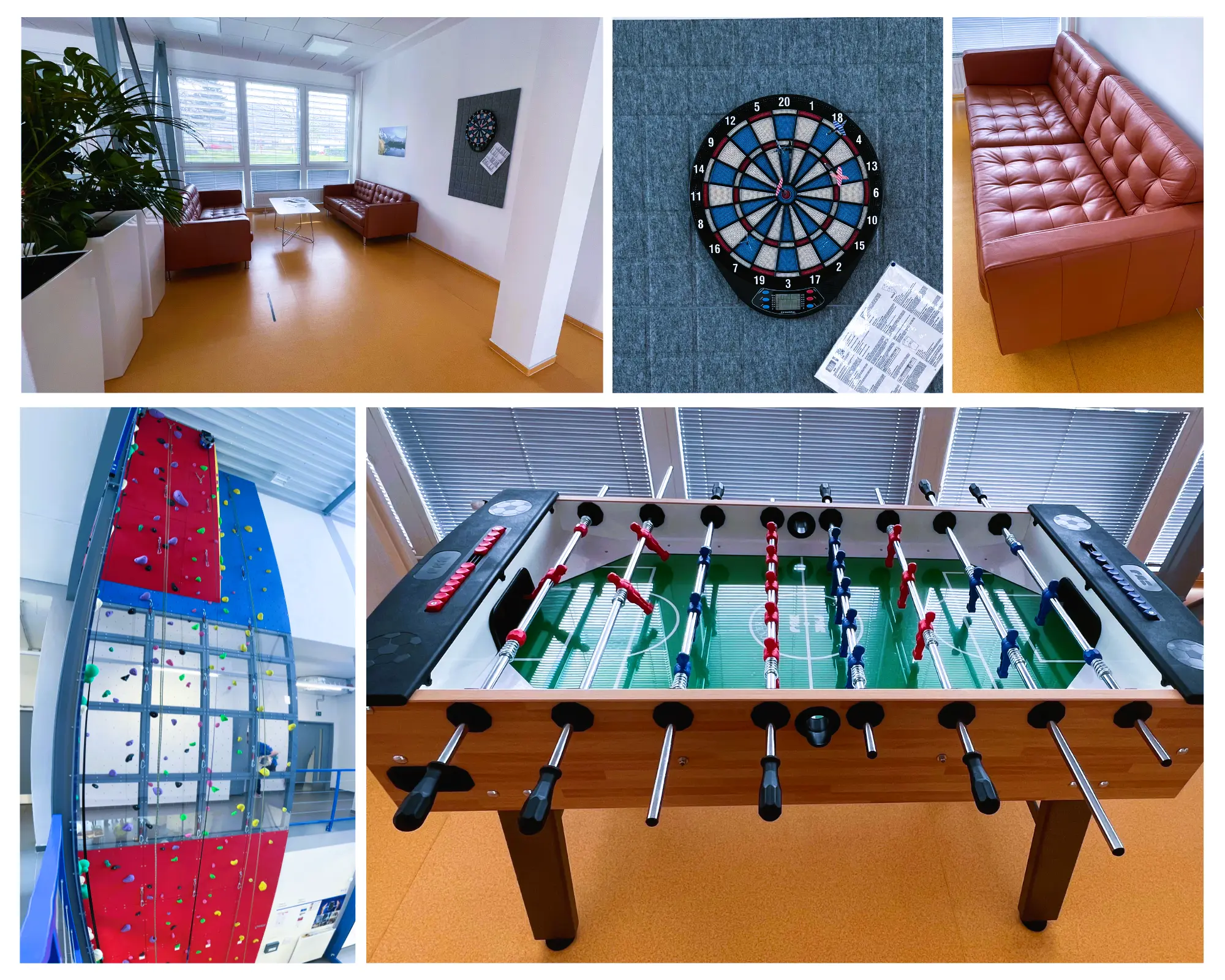 Někdy je třeba se v práci odreagovat, pohlédnout na problém jiným způsobem nebo se třeba jen trochu protáhnout. Kromě běžných možností jako jsou šipky, fotbálek nebo relaxační kout s gaučem, máme v SALTEK také vlastní lezeckou stěnu. Ta je všem našim zaměstnancům volně přístupná a o víkendech si mohou přizvat také kamarády nebo rodinu a strávit tak aktivní víkend se svými nejbližšími. K dispozici jsou na zapůjčení také lezecké sedáky pro děti i dospělé.
